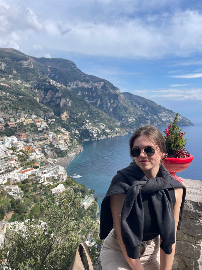 A young woman stands on a stone overlook, offering a panoramic view of Positano, Italy, and the Mediterranean coastline. The subject, positioned right of center, wears sunglasses, a black sleeveless t…read more