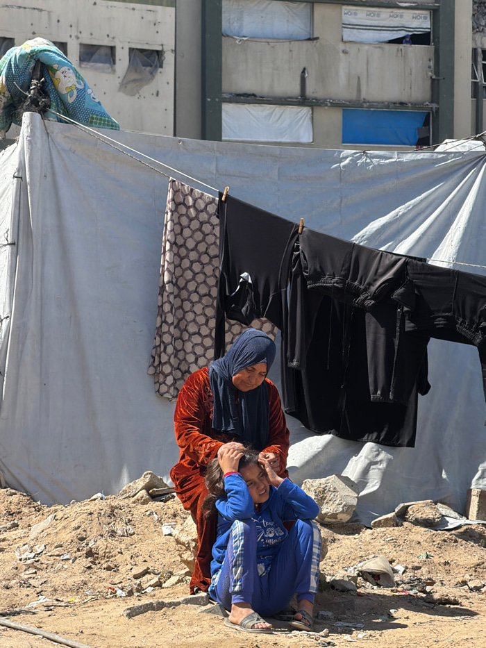An outdoor scene in an unspecified location within the city of Gaza, Palestinian Territory, features two females in the foreground against a backdrop of temporary shelter and damaged buildings. An old…read more