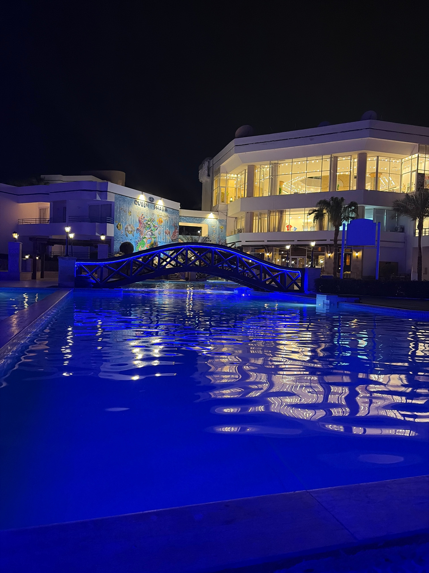The image depicts a nighttime scene at the Queen Sharm Resort in Sharm El Sheikh, Egypt. A blue-lit pedestrian bridge spans over a body of water, possibly a pool or a decorative water feature. The wat…read more