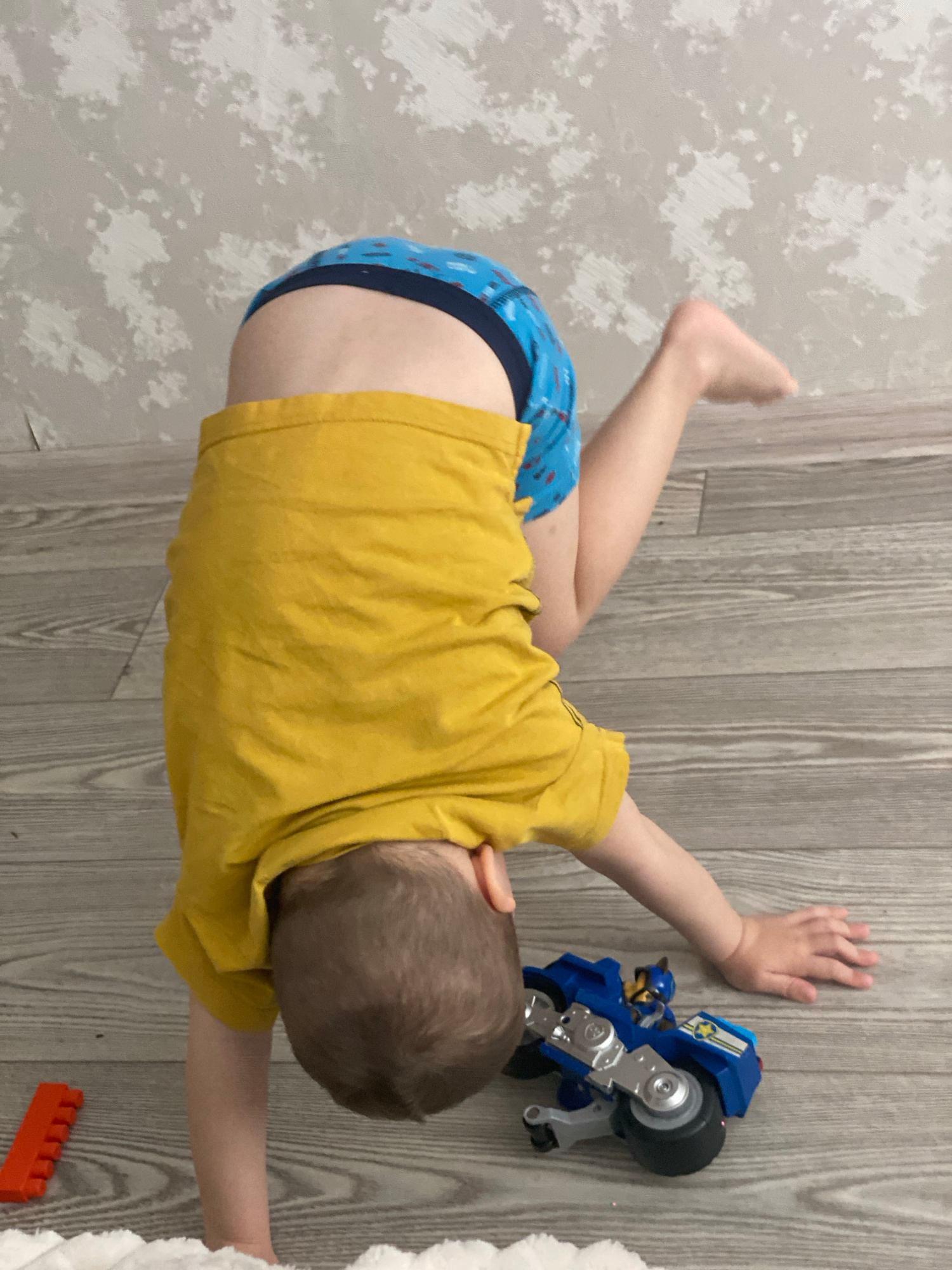 A young child is lying on a wooden floor in an interior setting, wearing blue patterned underwear and a yellow t-shirt. The child is positioned near a wall with a patterned design. A blue toy motorcyc…read more