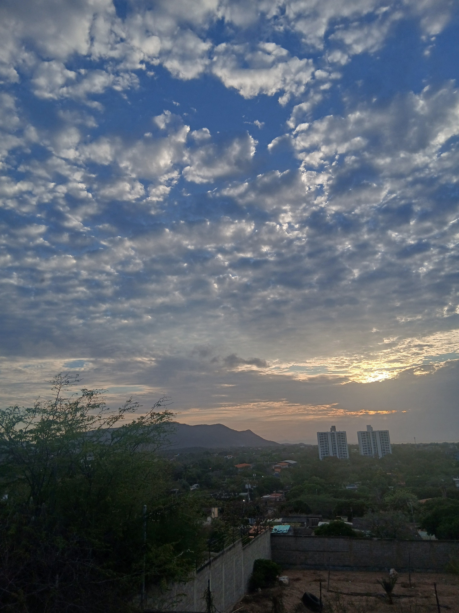 The image captures a partially obstructed view of a sunset over Juan Griego, Venezuela. The foreground is dominated by a sky filled with small, puffy clouds against a blue backdrop. Lower in the frameβ¦read more