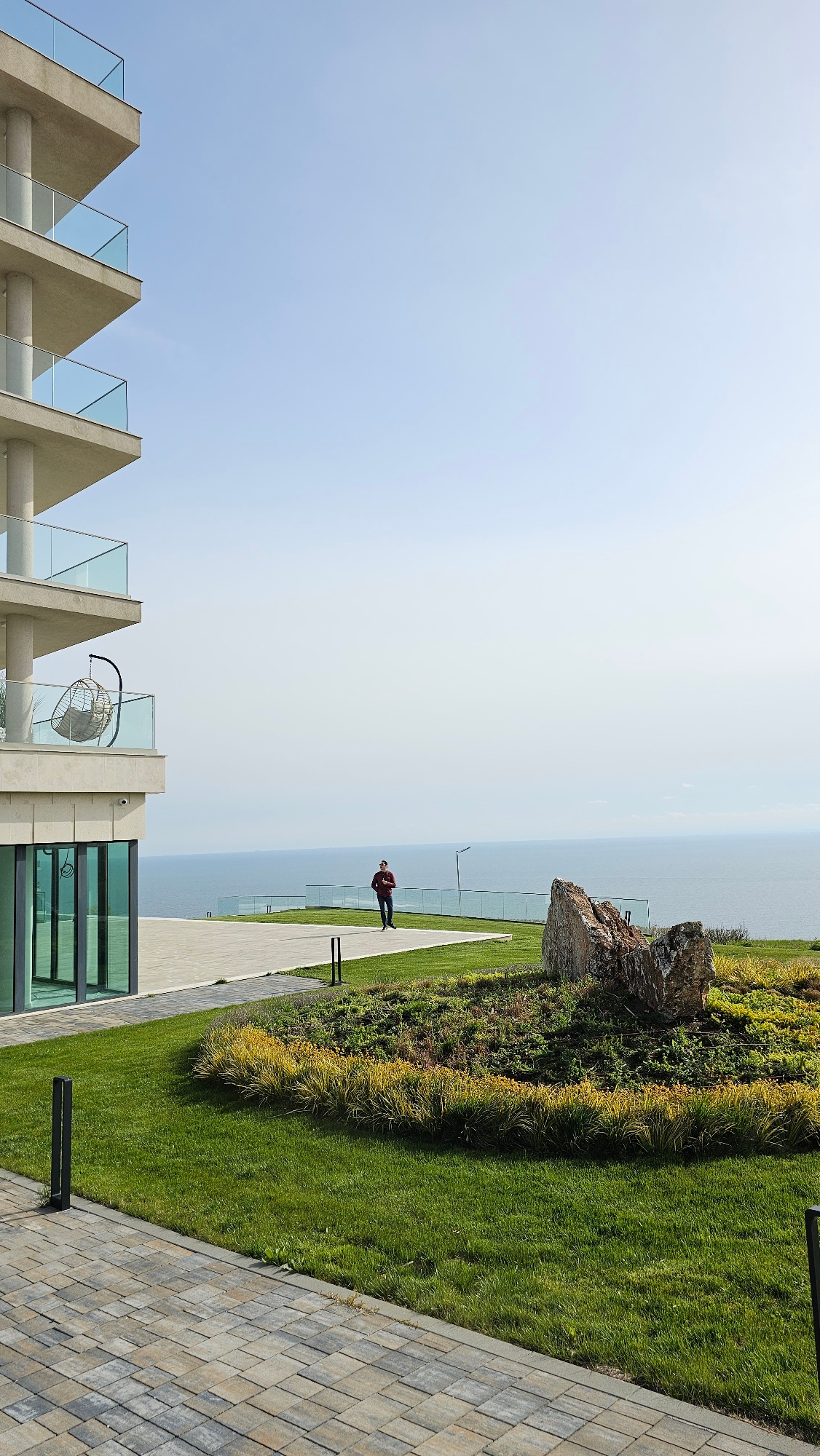 The image presents a landscape overlooking the Black Sea in Kavarna, Bulgaria. A man in a red jacket stands along a concrete walkway bordered by a low glass barrier. Beyond the barrier is the sea and…read more