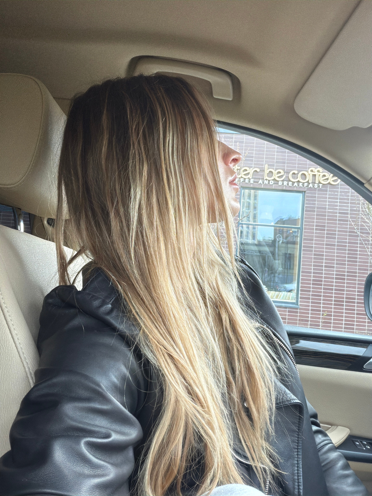 A woman is reclining in the back seat of a car. She has long, light brown and blonde hair, and she is wearing a black leather jacket. Outside the car window is a building with "er be coffee" printed o…read more