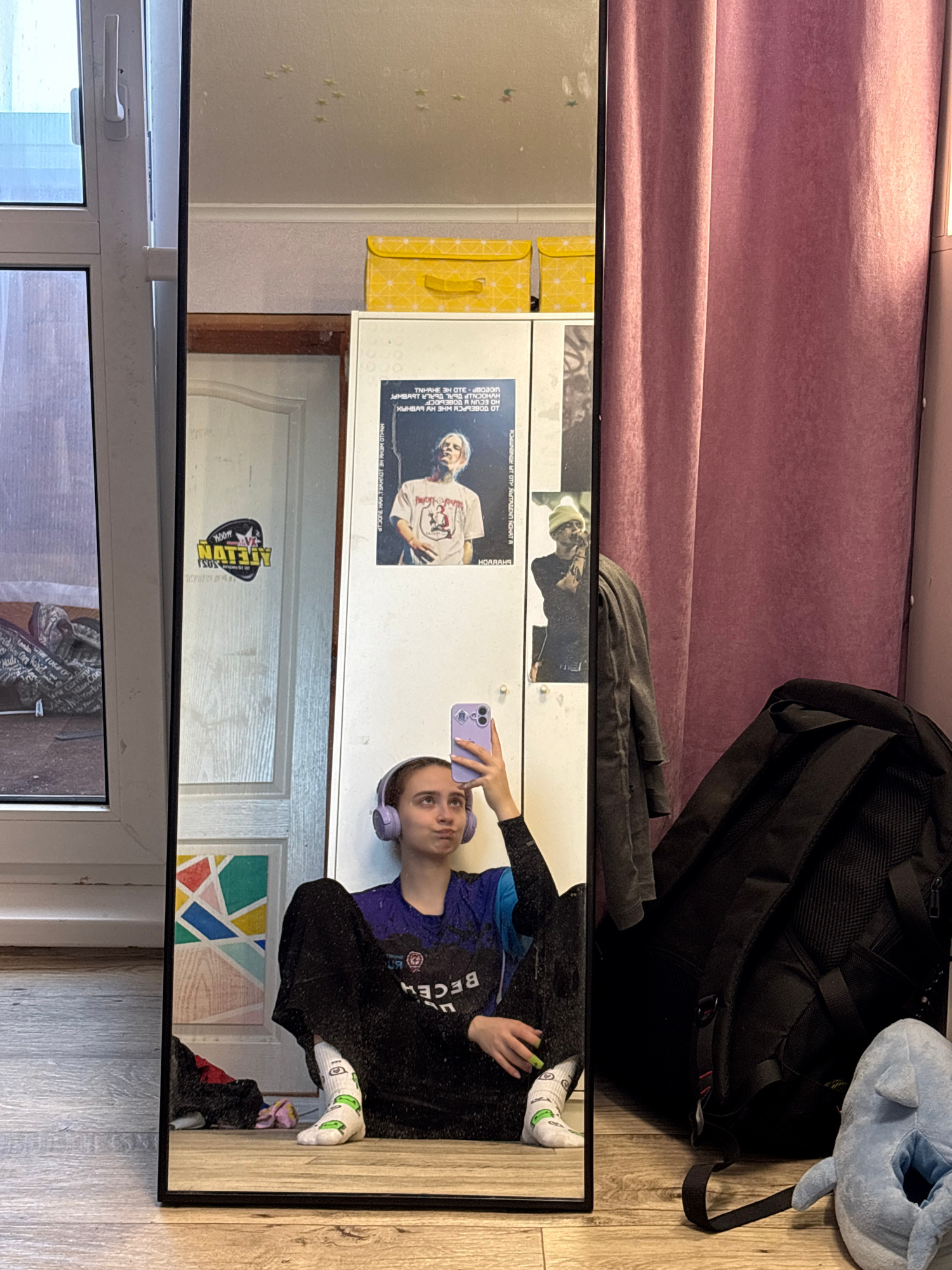 The image shows a mirror in a room. In the mirror's reflection is a person taking a selfie with a purple phone while wearing purple headphones, a blue and black shirt with the word "BECEM" on it, and…read more