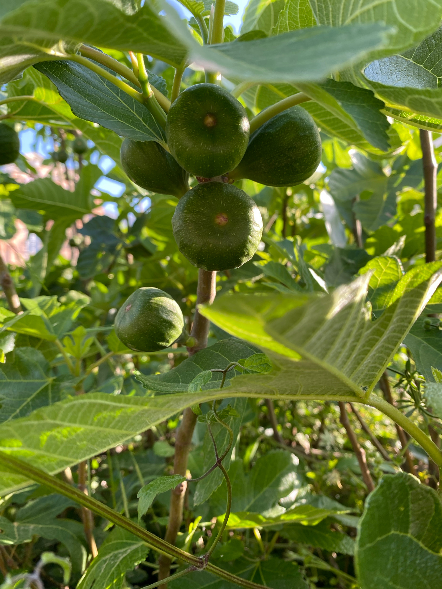 The vibrant image captures a close-up view of a fig tree laden with green, unripe figs. Several smooth, spherical to teardrop-shaped fruits are visible, some clustered together, others hanging individ…read more