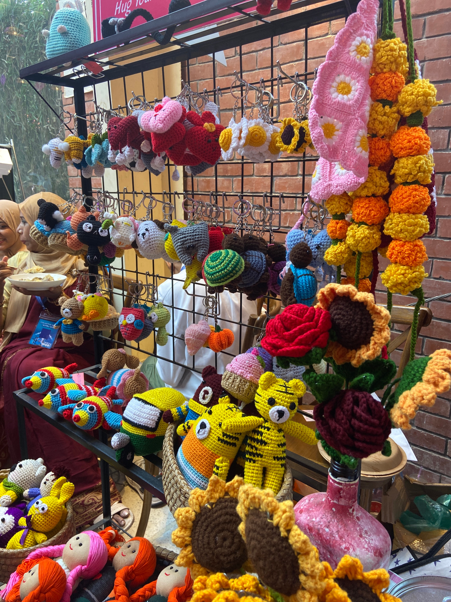 The image shows a collection of handcrafted items, likely for sale at a market or fair. The items, mostly crocheted, include flower garlands (marigolds and sunflowers), small animal keychains (tigers,…read more
