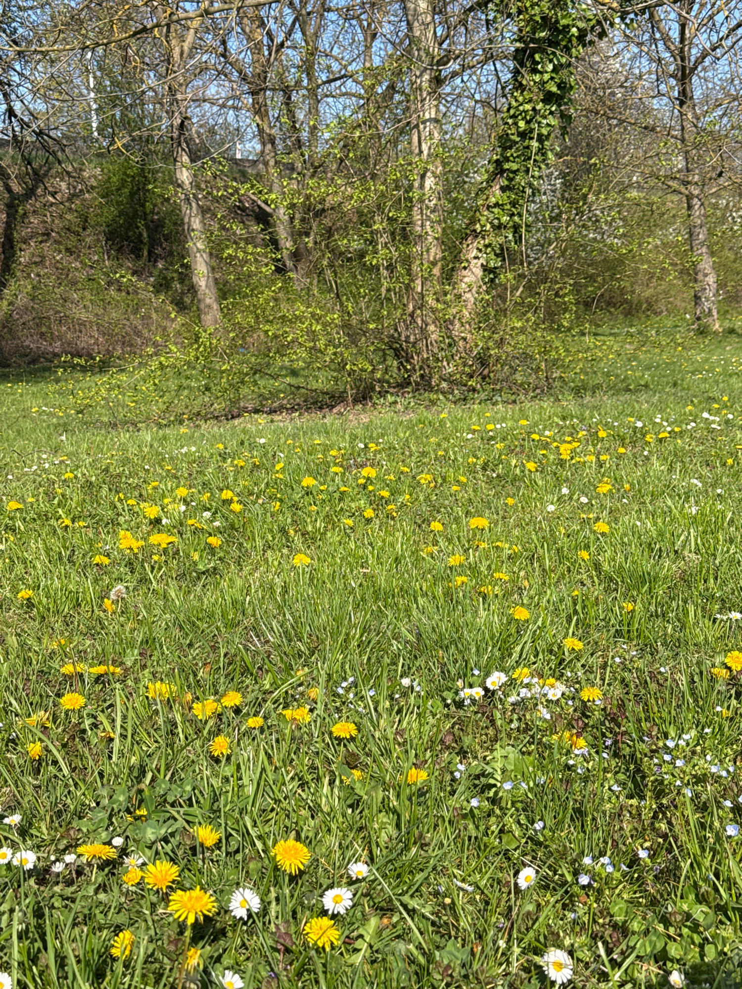 The image shows a grassy field with scattered yellow dandelions and white daisies. A line of trees is visible along the left edge of the frame, some with bare branches and others with fresh green foli…read more