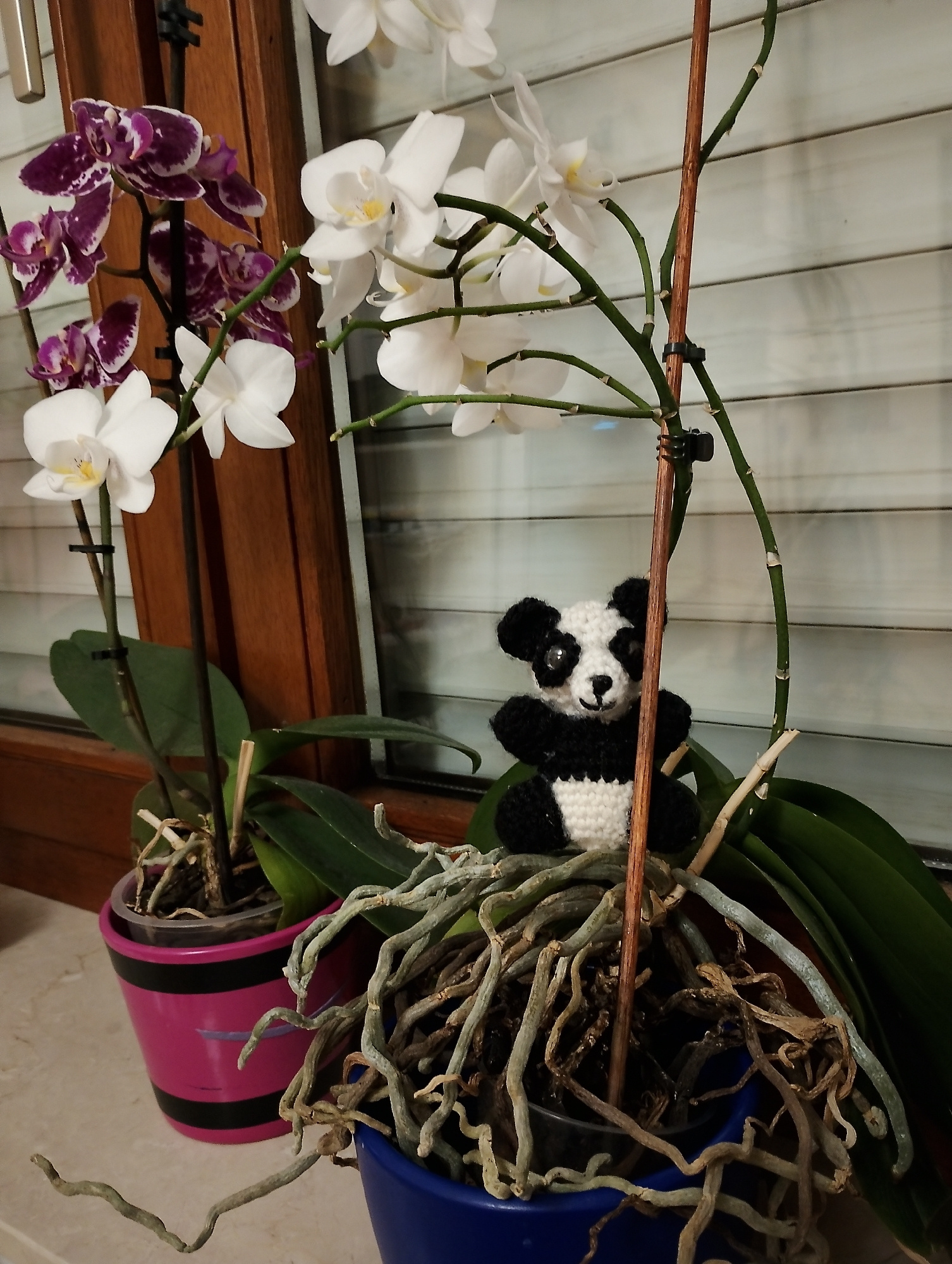 The image depicts two potted orchids on a surface, likely a windowsill, in front of a window with blinds. To the left is an orchid with purple and white blossoms in a pink pot with black stripes. To t…read more