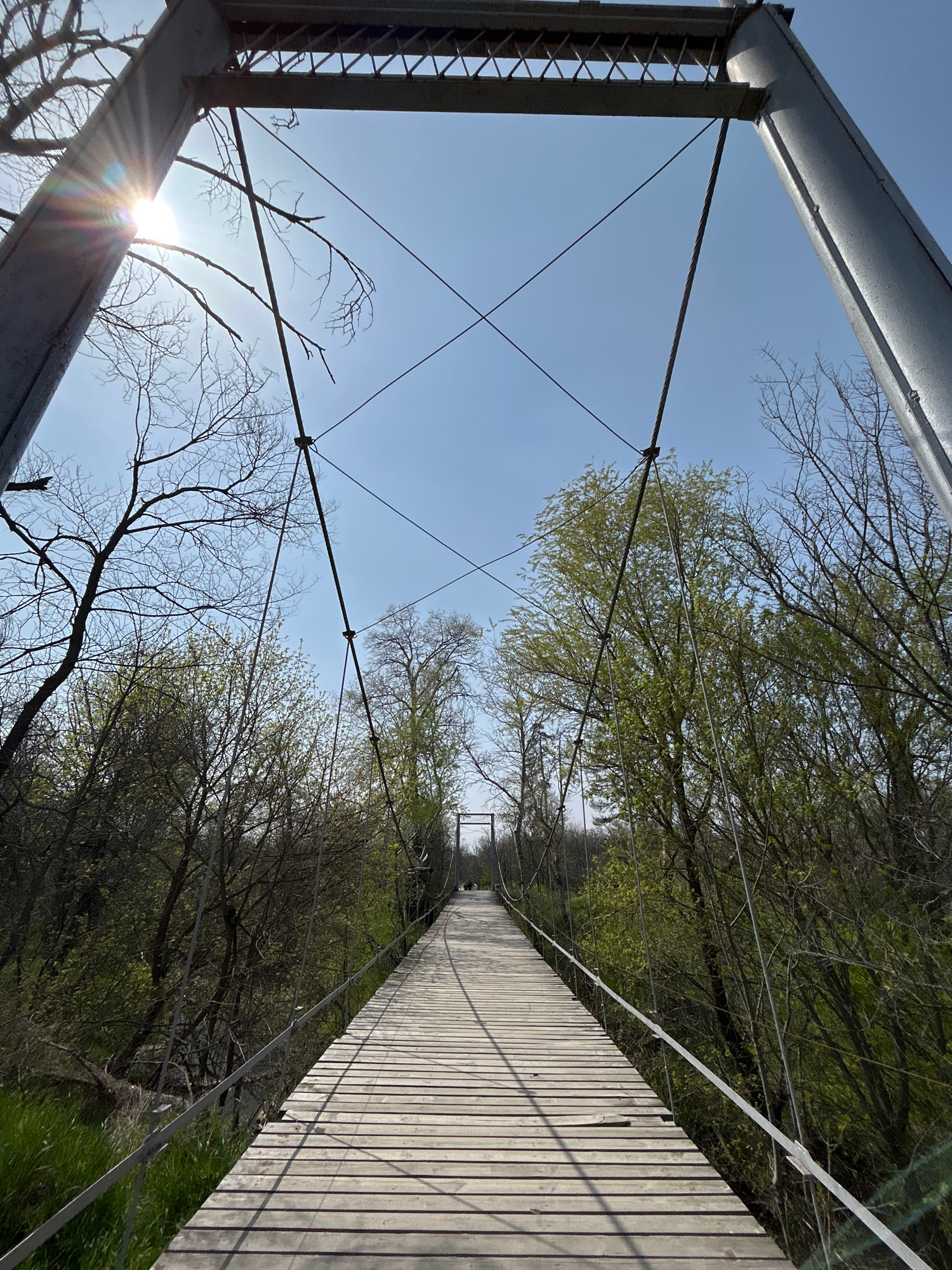 Looking up from below on a suspension bridge with wooden planks leading to the horizon. Trees line both sides of the bridge with some greenery. Steel cables support the bridge, crossing the sky. The s…read more