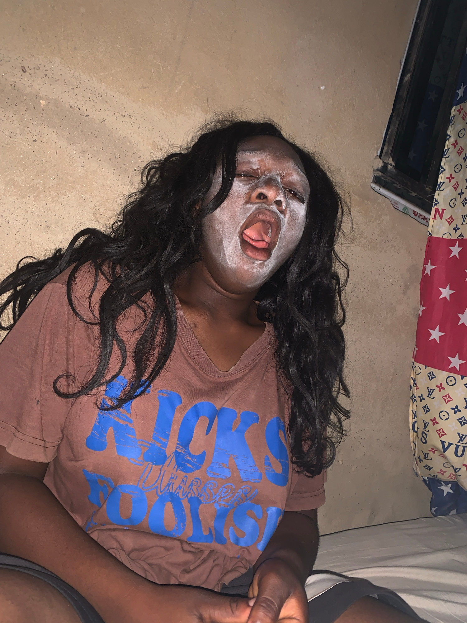 A Black woman lies supine on a pale tan surface, possibly a floor, with a white facial mask applied to her face. Her mouth is open, exposing her tongue. She is wearing a brown t-shirt with blue letter…read more