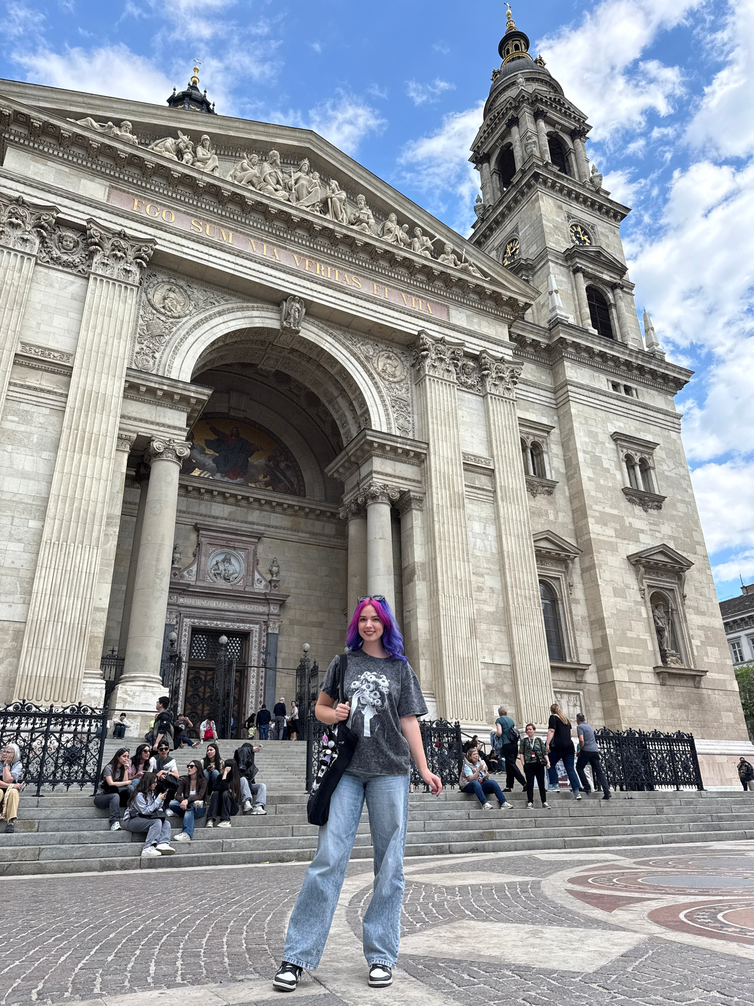 An upward-facing, rotated photo captures a vibrant young person posing in front of a grand, ornate stone building, likely a basilica, under a bright, cloudy sky. The main subject, positioned on the lo…read more