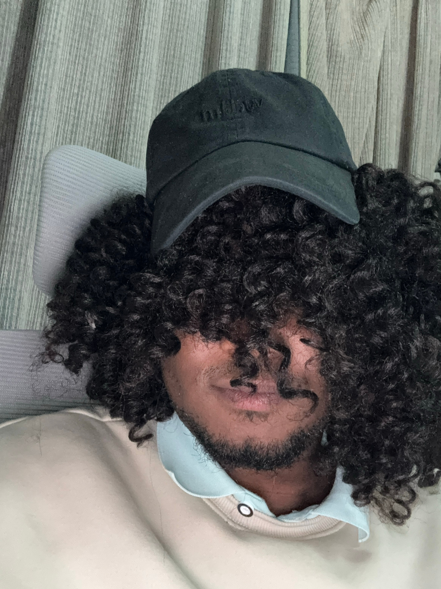 A person with dark curly hair and a beard is wearing a black baseball cap and a light-colored hoodie. The person is lying down on a striped surface, possibly a couch or bed. The photograph provides a…read more