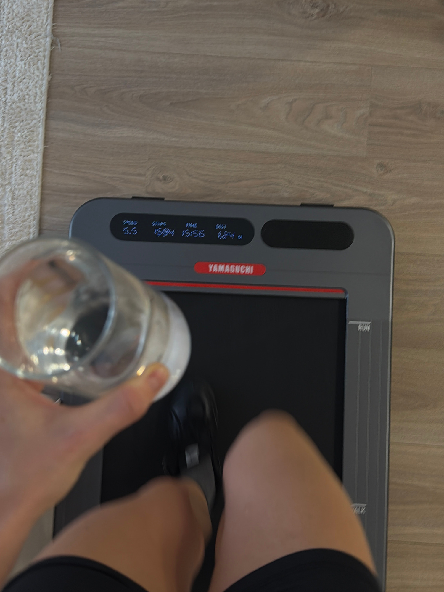 A high-angle, indoor shot shows a person walking on a gray and black Yamaguchi treadmill with a red accent line. The person is wearing black shorts. The treadmill's display panel shows "YAMAGUCHI" and…read more