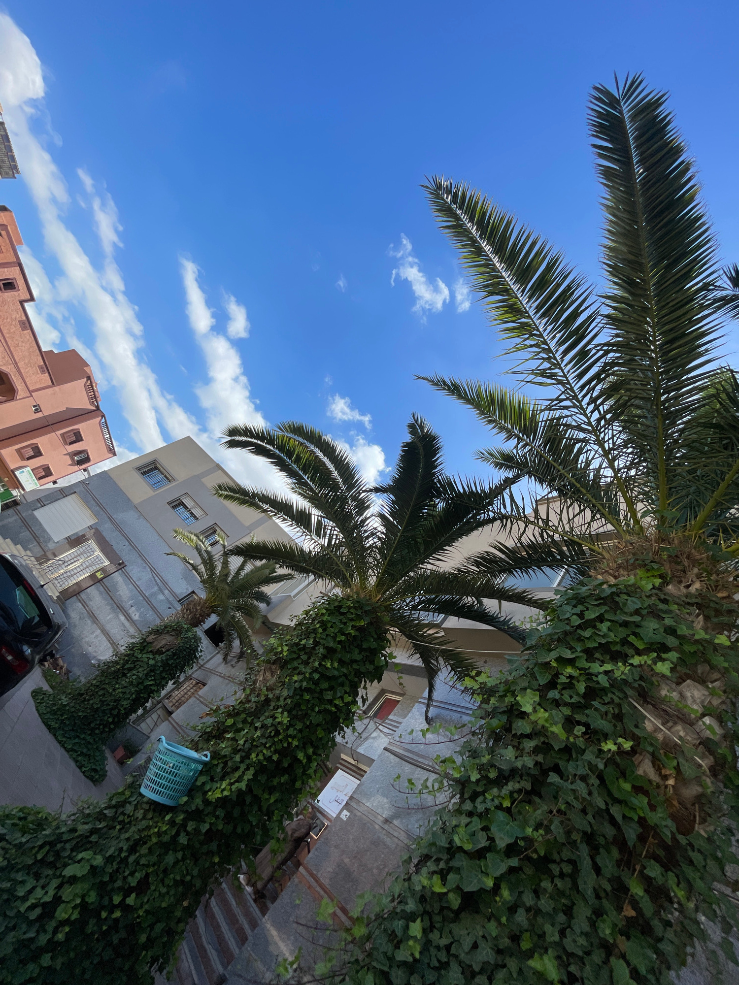 The image shows a street scene in Safi, Morocco, angled upward towards the sky. Two palm trees dominate the view, their fronds reaching into a blue sky with scattered white clouds. The trunks of the t…read more