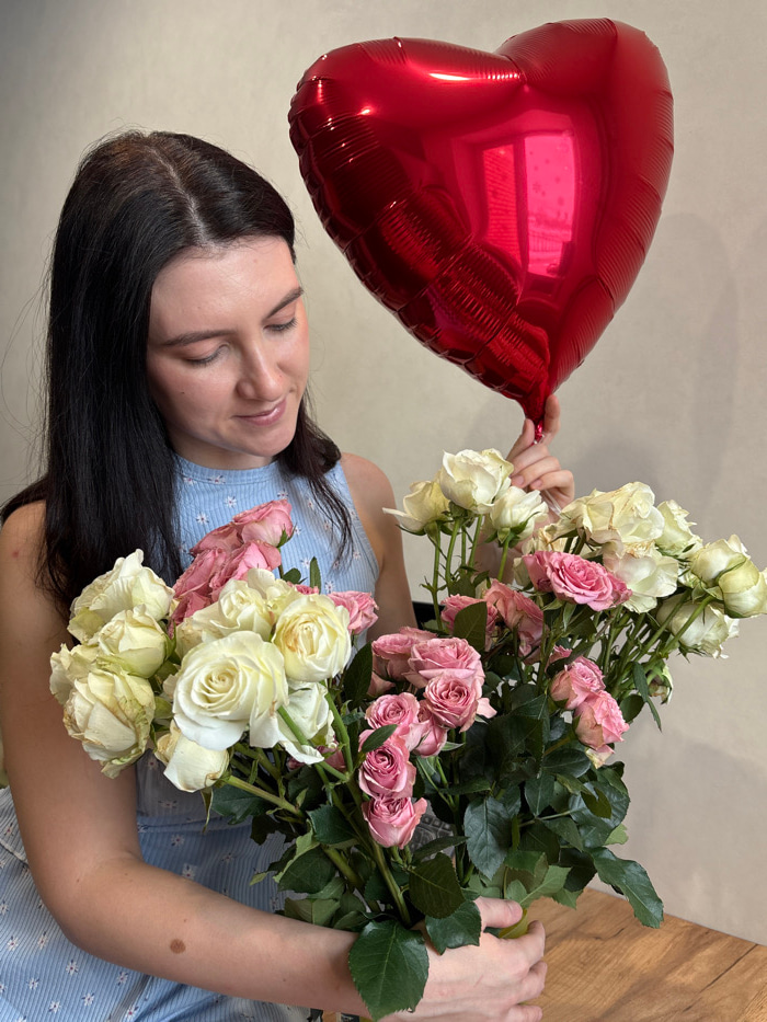 A single female subject is depicted in an indoor environment in Kazan, Russia. She has long, dark hair parted centrally and wears a light blue sleeveless top with a small white floral pattern. Her hea…read more