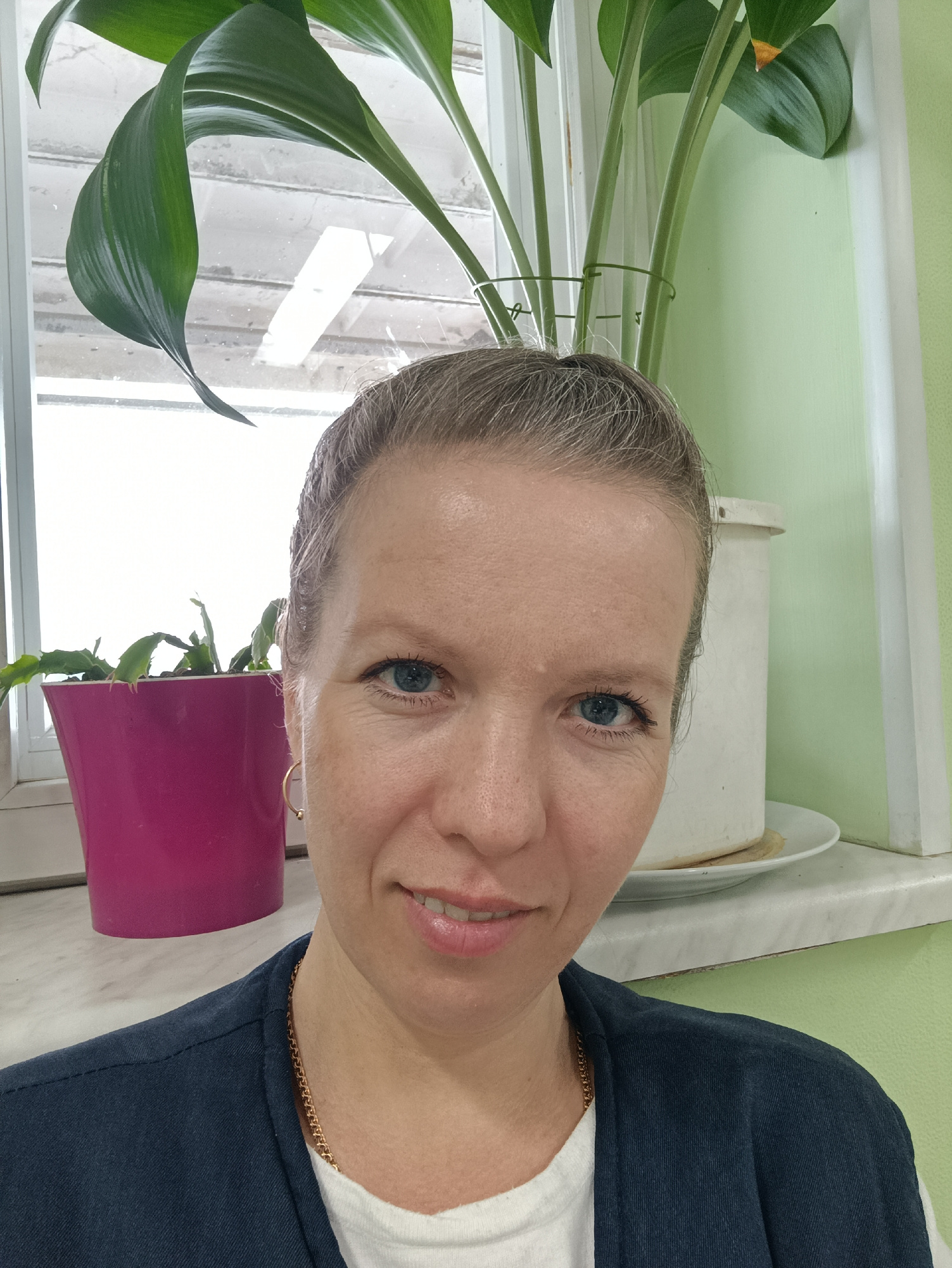 A head-and-shoulders shot of a fair-skinned woman with light blue eyes and blonde hair pulled back from her face. She wears a dark blue jacket over a white shirt, and a thin gold chain is visible arou…read more