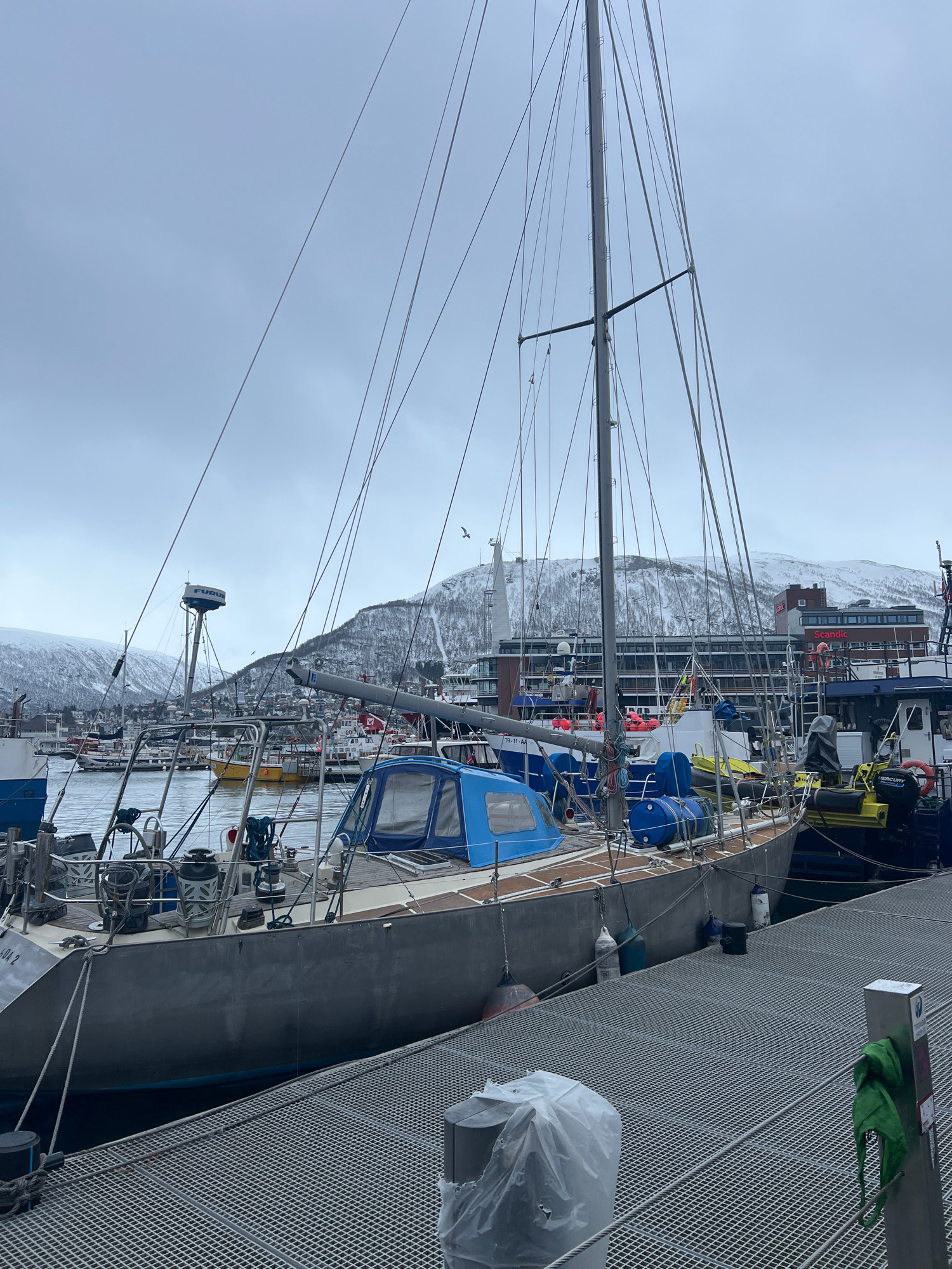 A sideways, high-angle shot depicts a sailboat docked at a marina in Tromsø, Norway. The sailboat, predominantly grey, is secured alongside a metal grid pier. Its tall mast extends upwards, intertwine…read more