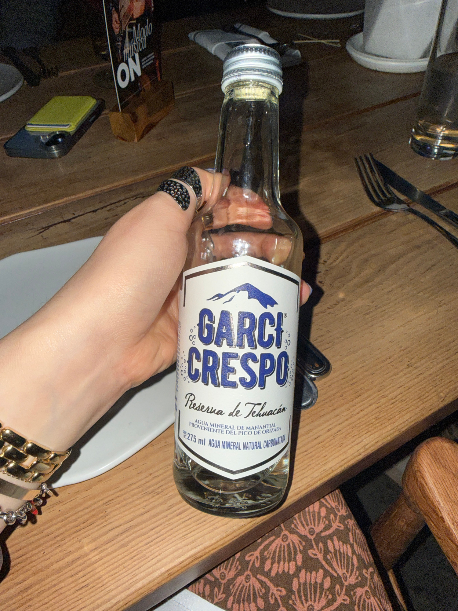 The image shows a hand holding a glass bottle of Garci Crespo mineral water. The bottle is labeled "Reserva de Tehuacán," indicating the water's origin from the Pico de Orizaba region. The hand has se…read more