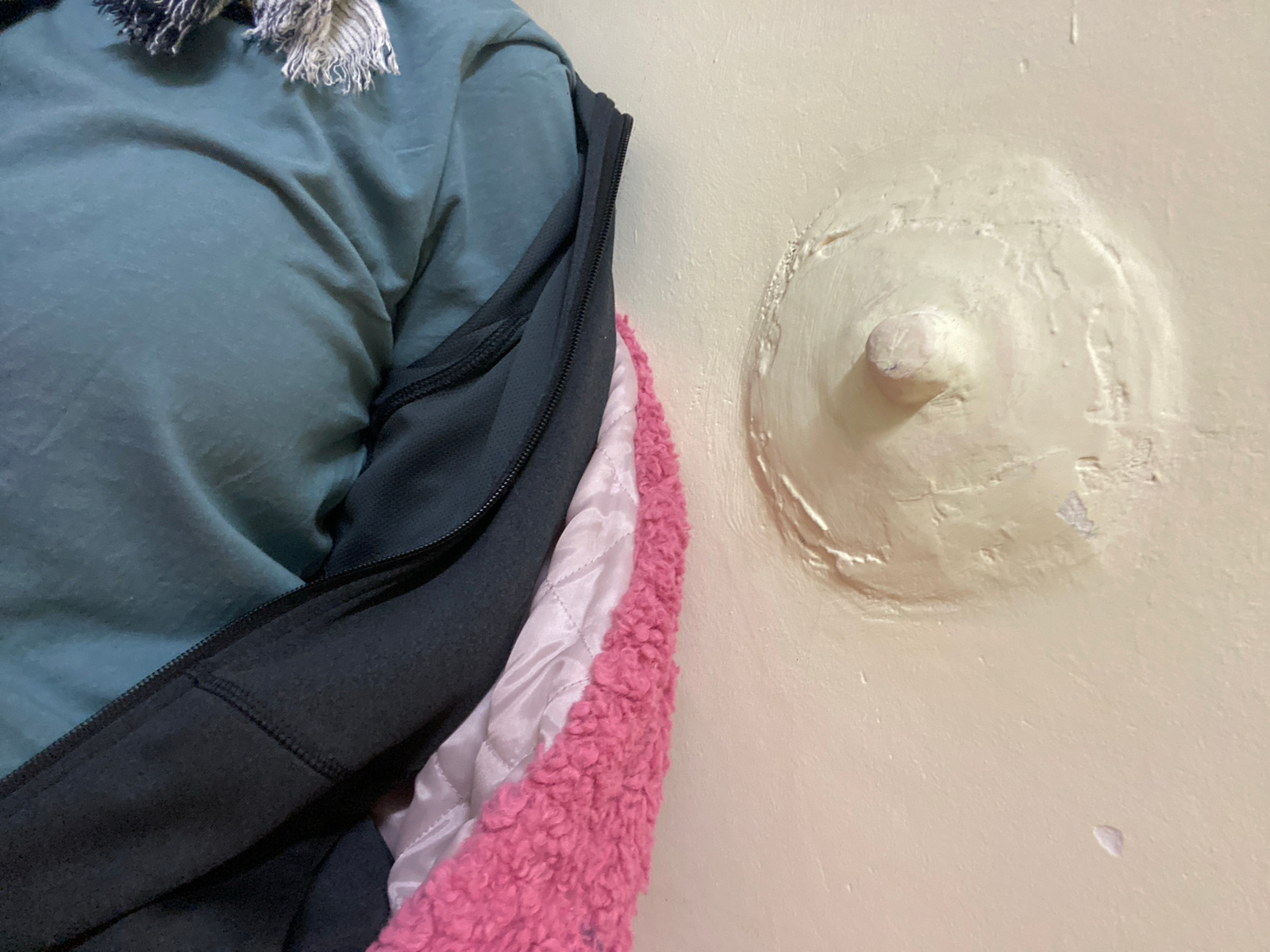 The image displays a close-up, slightly angled view of clothes hanging on a wall-mounted fixture. On the left side, a light, possibly off-white or cream-colored wall features a prominent, circular ind…read more