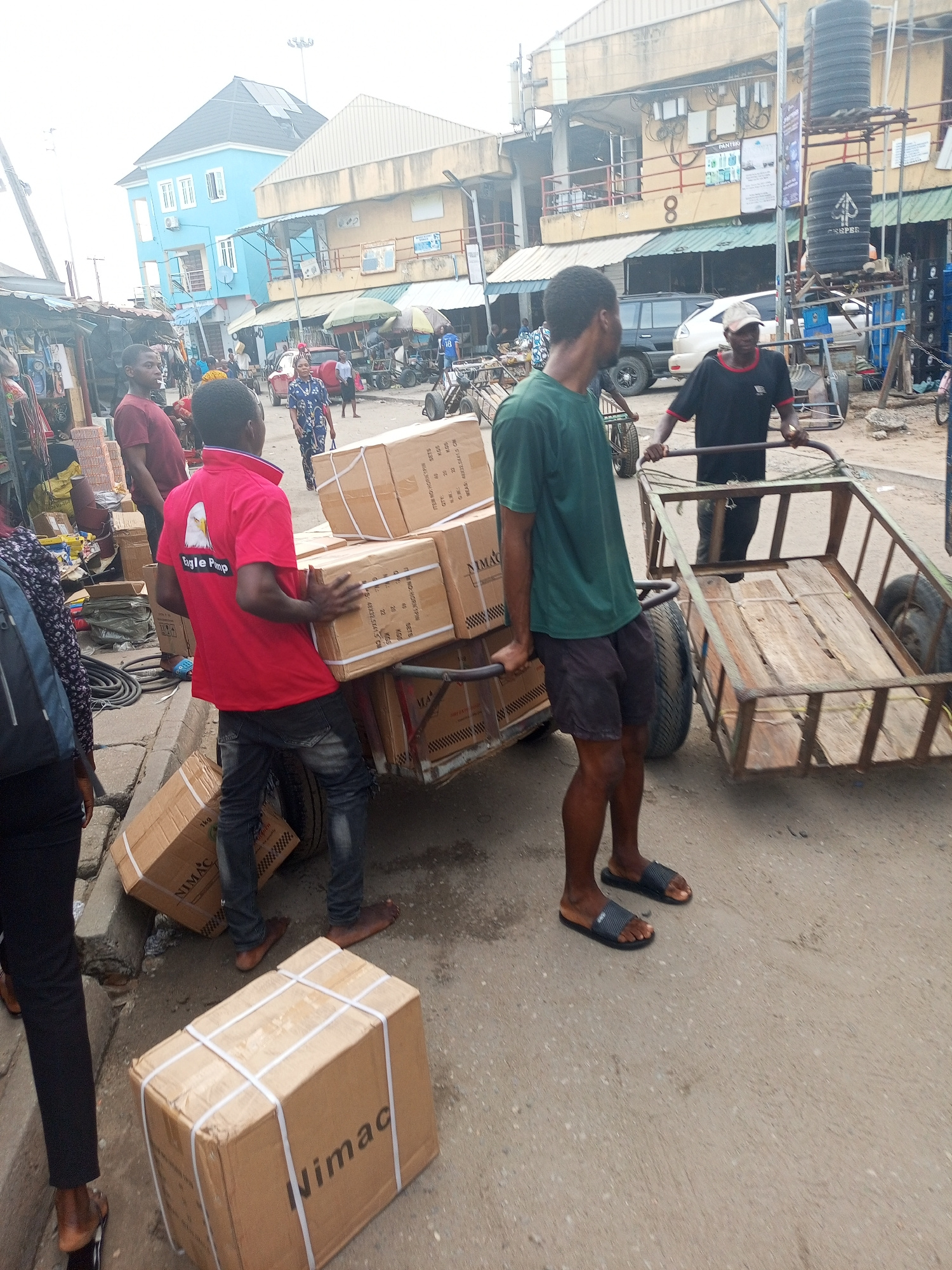 The image depicts a busy street scene in Satellite Town, Nigeria, bustling with commercial activity under bright daylight conditions. Several men are engaged in transporting goods using handcarts. Inβ¦read more