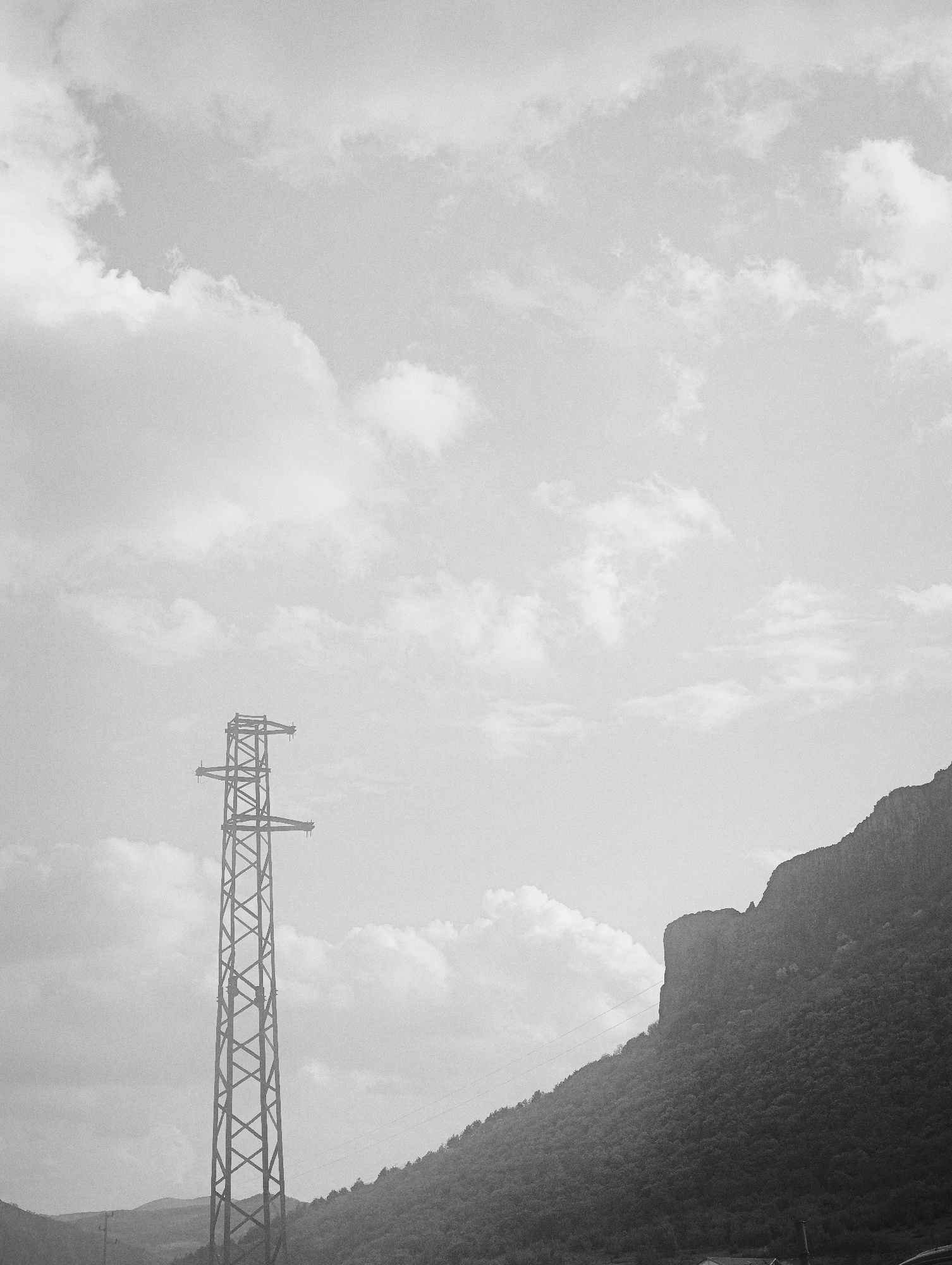 The image is a black and white photograph taken in Shiroko pole, Bulgaria. An electricity pylon stands prominently to the left, with power lines extending from it. In the background, a large, forested…read more