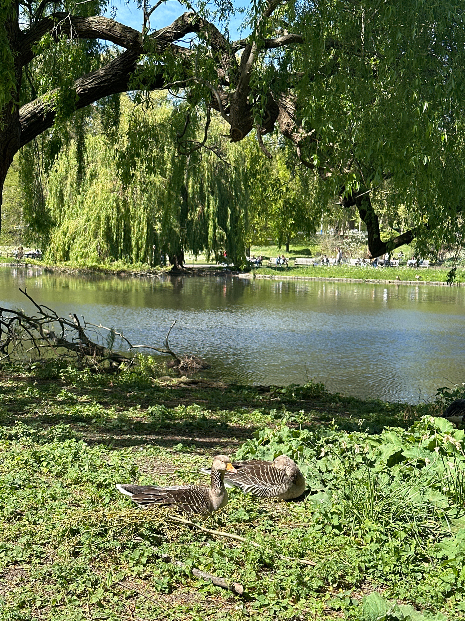 The image shows a park scene, possibly in London, United Kingdom. A body of water, likely a lake or a large pond, stretches across the center of the frame, its surface reflecting the surrounding green…read more