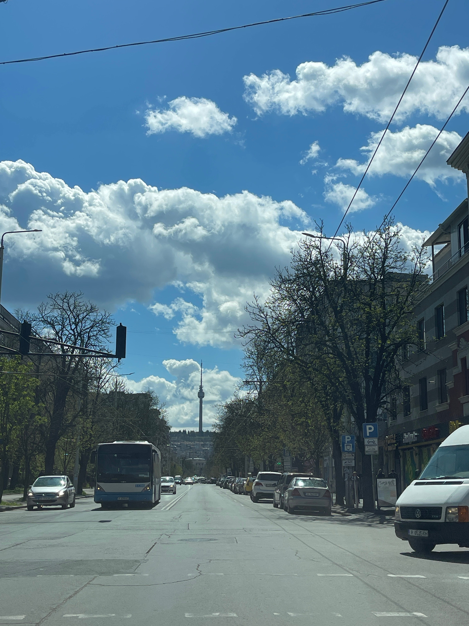 The image depicts a street scene in Ruse, Bulgaria, with a clear blue sky dotted with cumulus clouds. A wide road stretches into the distance, flanked by trees and buildings on both sides. Cars are pa…read more