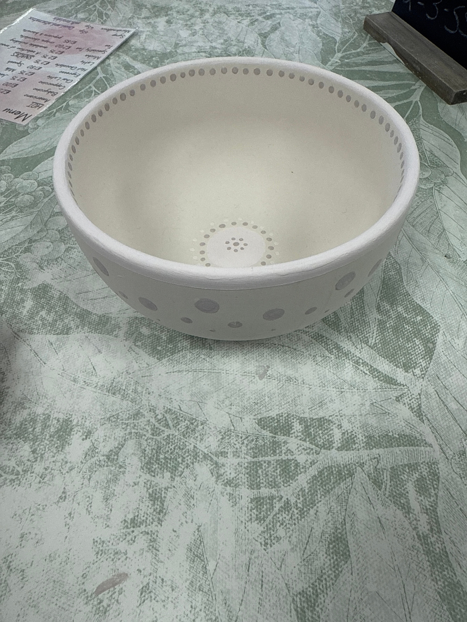 The image shows a white bowl with grey polka dots resting on a patterned surface. A handwritten menu is partially visible, listing hot beverages like Americano, Babyccino, Cappuccino, and Latte, alongβ¦read more