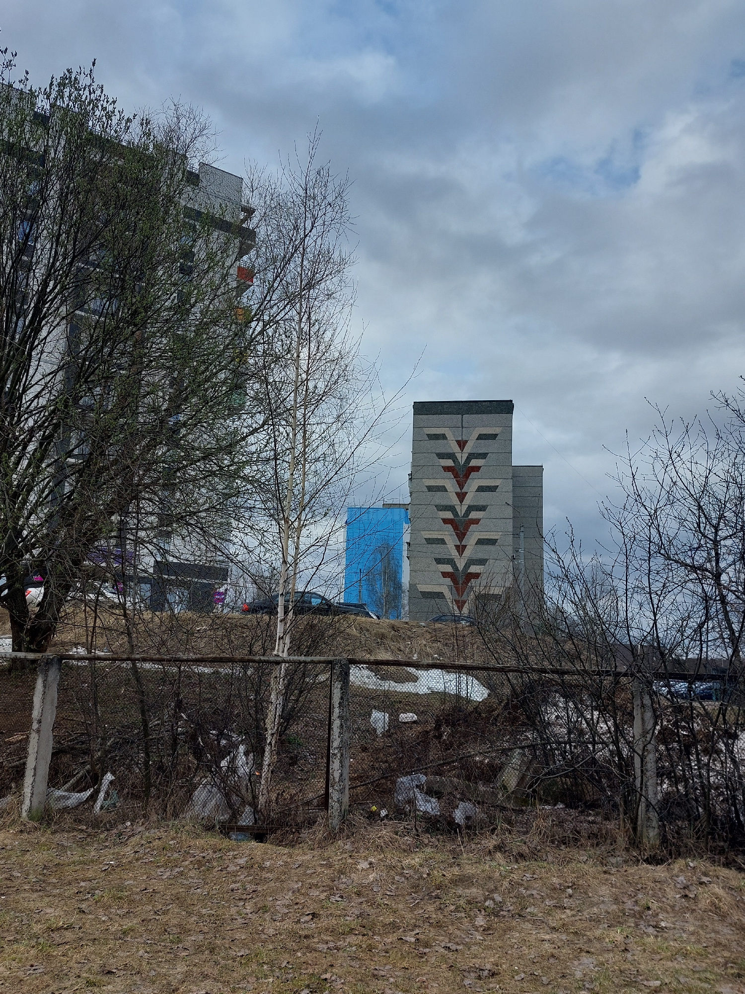 The image shows a gray apartment building in Chaikovsky, Russia. The building has a distinctive chevron pattern in red, gray, and white on its facade. The sky is overcast with gray clouds. A chain-lin…read more