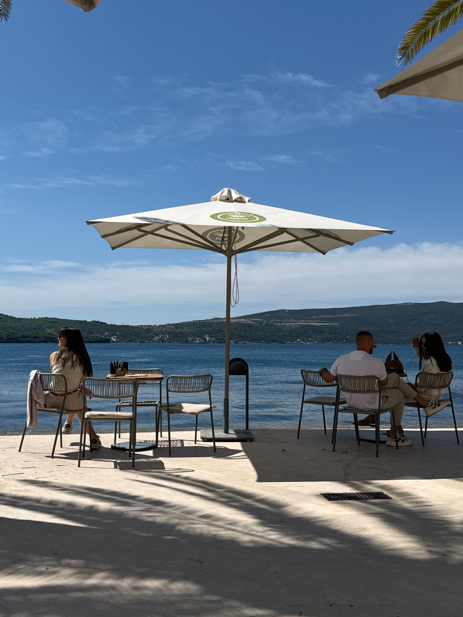 The image depicts an outdoor dining area in Tivat, Montenegro, adjacent to a body of water, likely the Bay of Kotor. Several people are seated at tables, some appear to be tourists enjoying the view a…read more