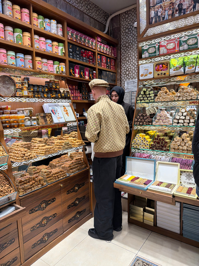 This image presents the interior of a confectionery shop, identifiable by its extensive displays of traditional Turkish sweets, strongly suggesting a location in Istanbul, Turkey. In the foreground,…read more