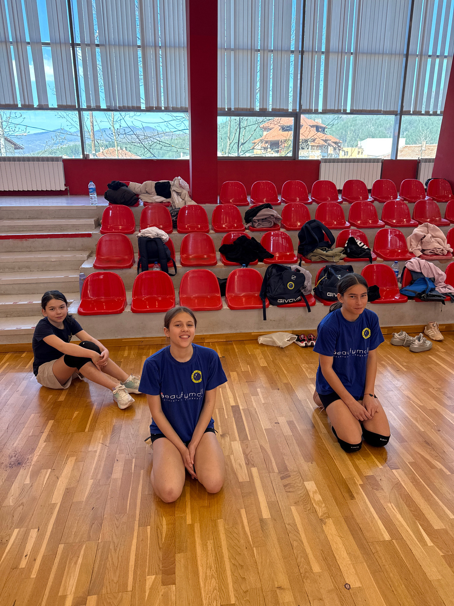 Three adolescent females are present in an indoor gymnasium setting. The room features wooden flooring and red spectator seating. The seating rows on the left side of the image are partly occupied wit…read more