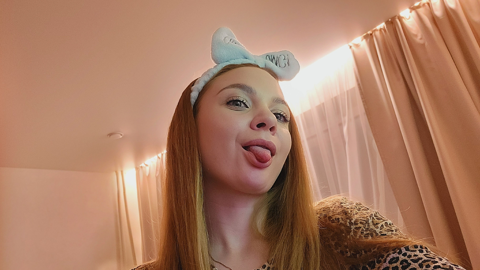 A young woman with light brown hair and a blue bow headband is making a silly face with her tongue sticking out. She is wearing a leopard print shirt. Behind her is a room with beige curtains and what…read more