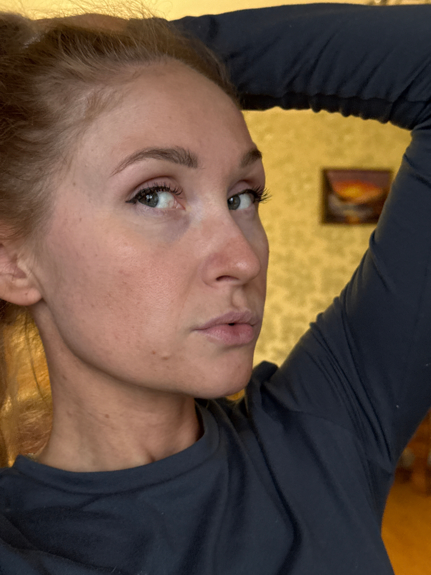 A woman with fair skin and light brown hair is positioned at an angle in the frame, looking upwards. She is wearing a dark blue long-sleeved shirt. Her left arm is raised behind her head. Her eyes are…read more