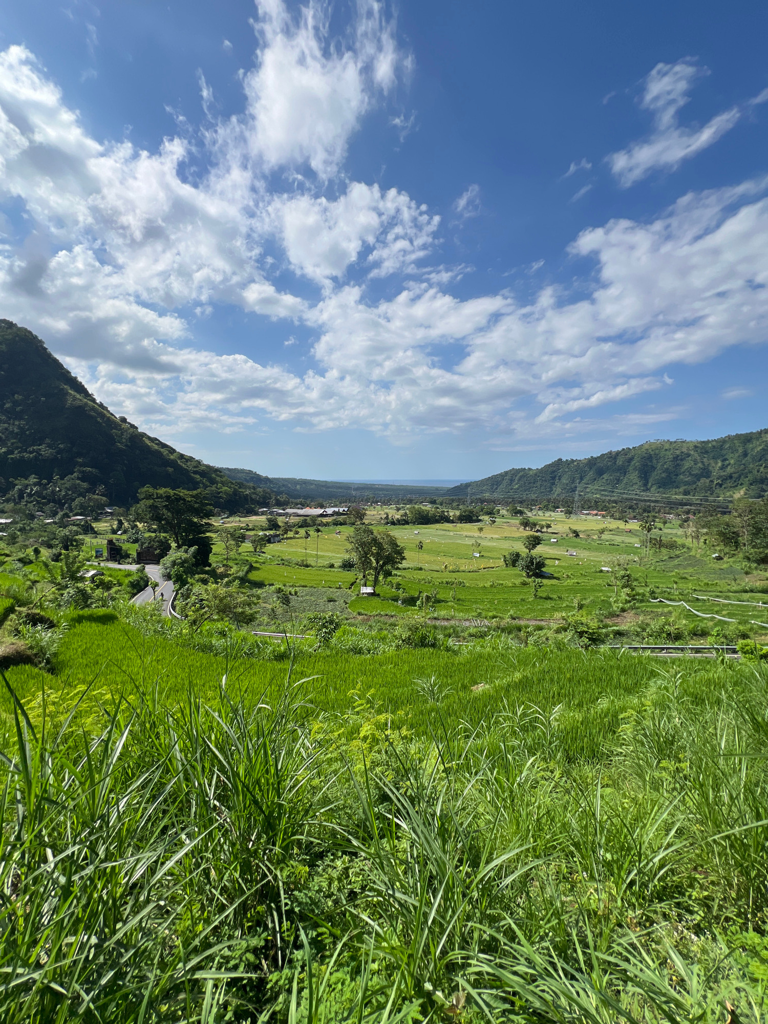 The image depicts a landscape in Abang, Indonesia. The sky is blue with scattered white clouds. A ridge of land runs from the lower left to the upper right of the image, dividing the scene. Below the…read more