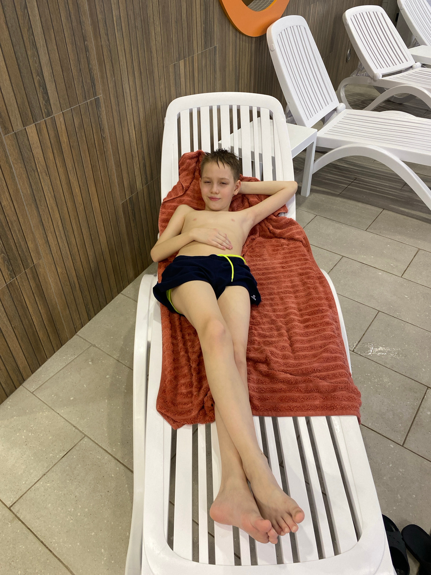 A young boy lies on a white plastic sun lounger, covered by an orange towel, wearing dark blue swimming trunks with neon green trim. He is fair-skinned, with short brown hair and is positioned horizon…read more