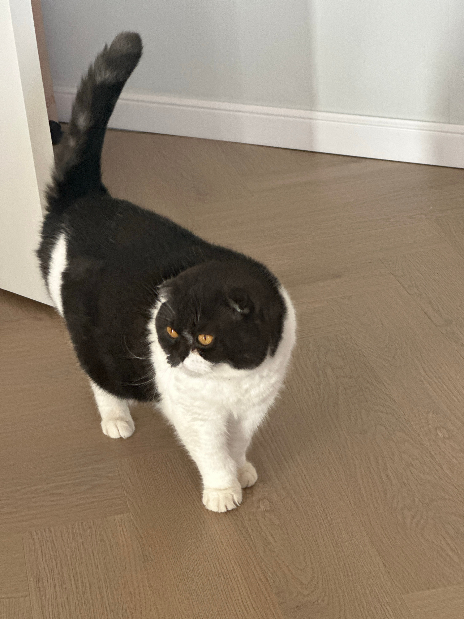 A top-down view depicts a black and white cat on a light brown hardwood floor next to a white structure, possibly a cabinet or wall. The cat has yellow eyes and a mostly black head and back, with a wh…read more
