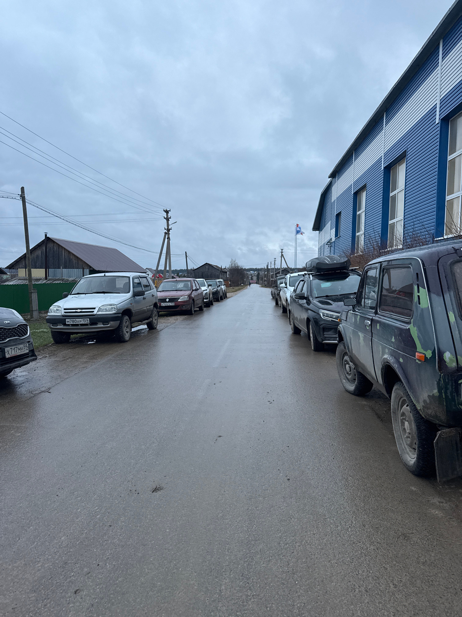 The image captures an overcast street scene in what appears to be a small town or rural settlement, consistent with Oktyabrsky, Russia. The perspective is from the roadside, looking down a line of par…read more