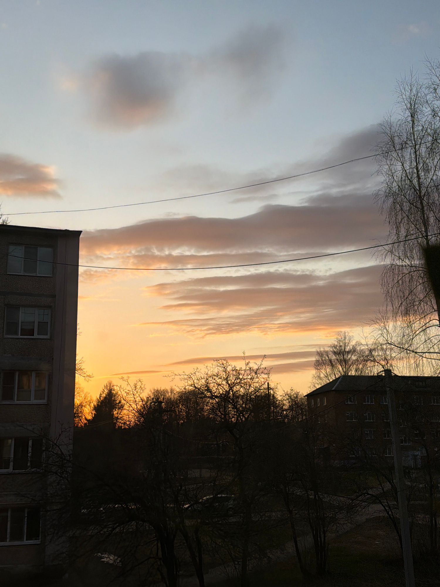 The image shows a view of the sky and surrounding structures, likely taken in Reshetnikovo, Russia. A building with visible windows occupies the foreground. Overhead, power lines stretch across the frame, intersecting the sky. The sky itself features distinctive cloud formations, with linear bands of clouds tinted in sunset colors. Silhouetted trees and another building are visible in the background. The overall lighting suggests either dawn or dusk. | Open Wire