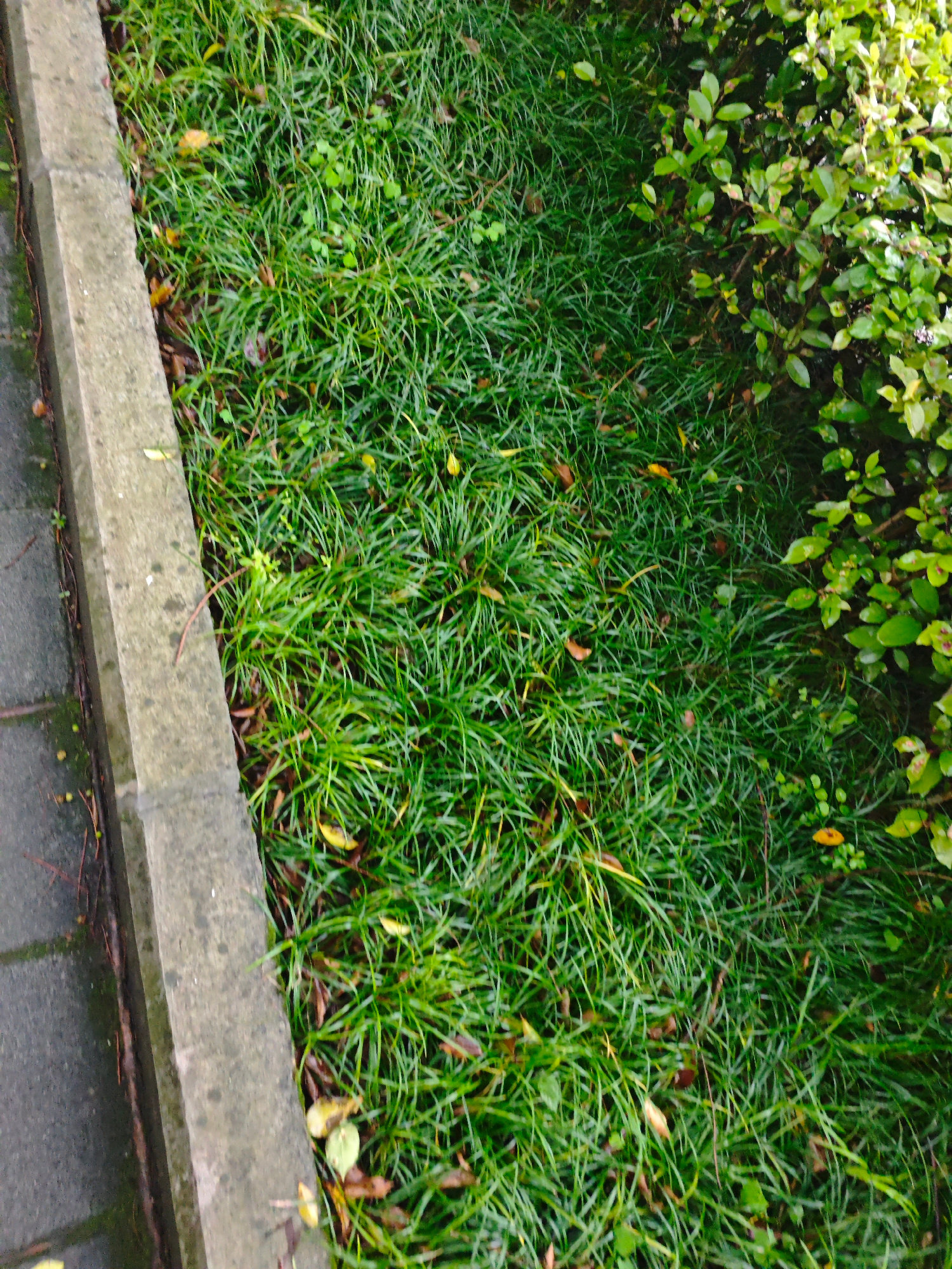 The image depicts a ground-level view of an urban environment. On the left side of the frame, there is a paved sidewalk with grey concrete slabs and a raised concrete border. Adjacent to the border, t…read more