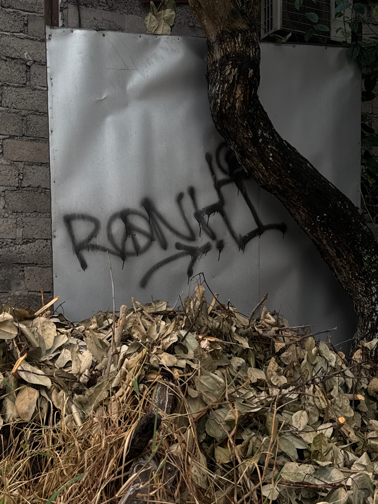 The image captures a static, dimly lit scene featuring natural and man-made elements, likely taken at night or under low light. A thick, dark tree trunk with textured bark diagonally crosses the upper…read more