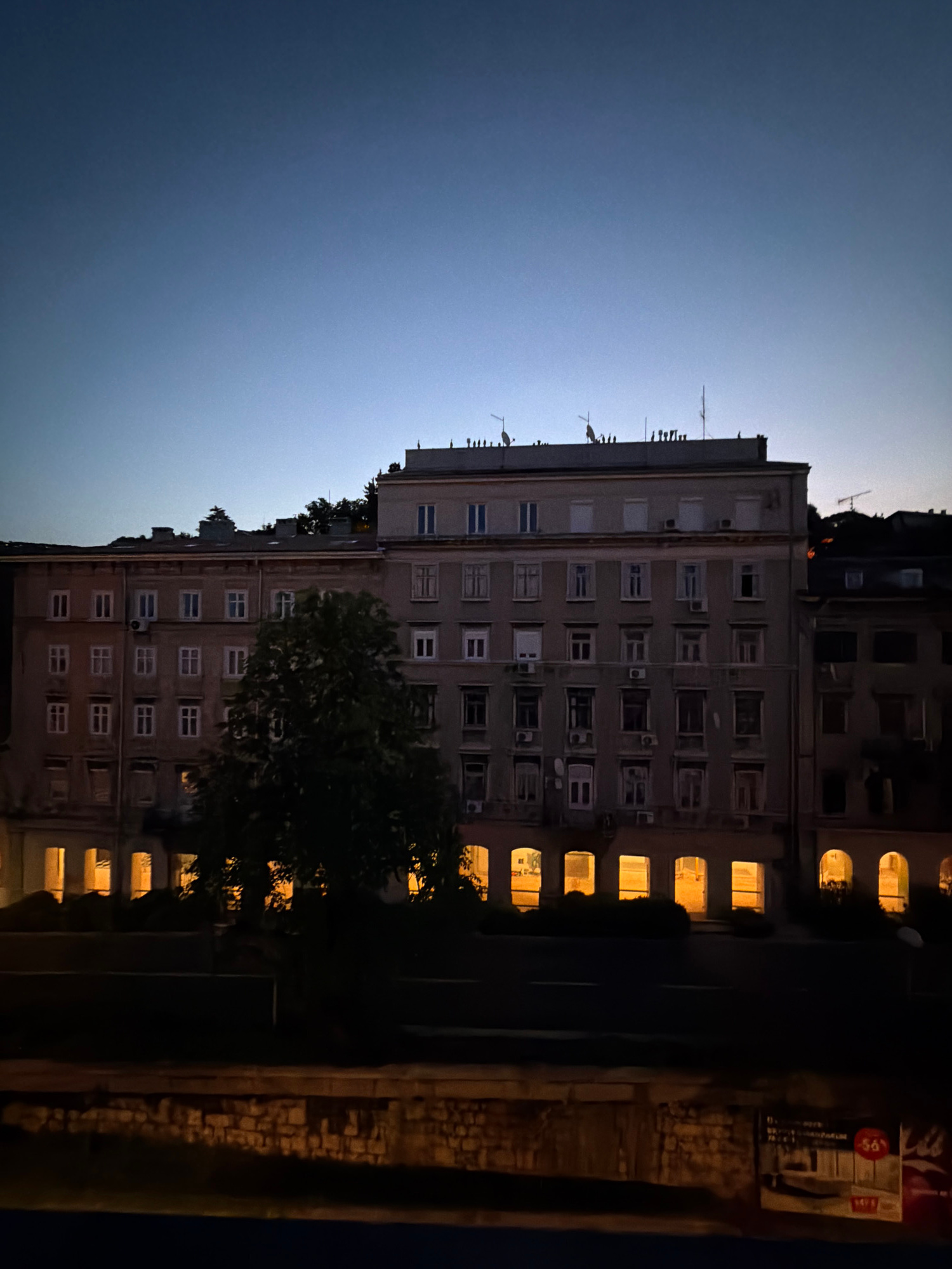 The image shows a view of a building at twilight in Grad Rijeka, Croatia. The building is tall, with multiple stories and many windows, some of which are illuminated from within. The facade is a light…read more
