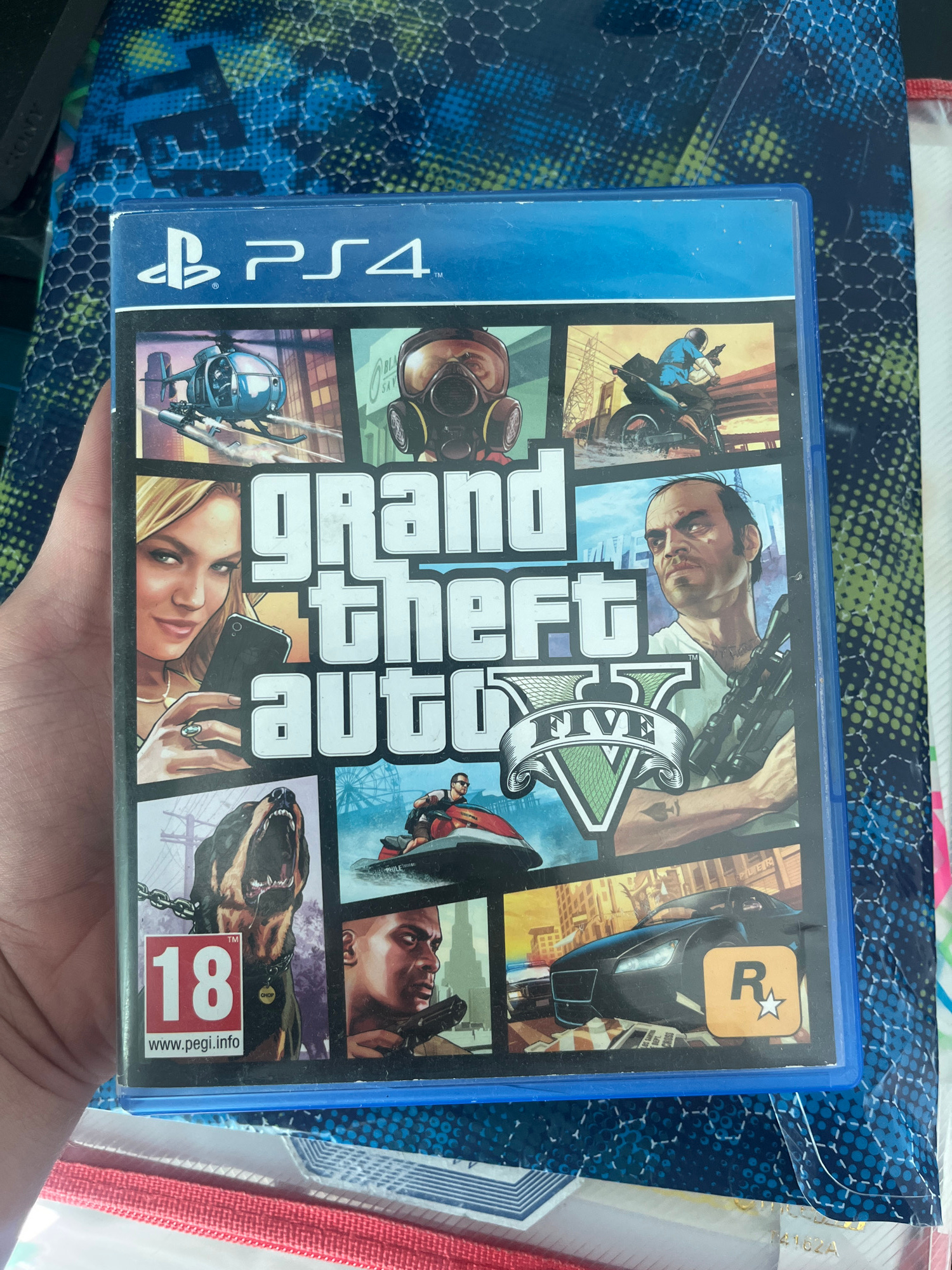 The image shows a PS4 game case for Grand Theft Auto V. The case is blue and features various characters and scenes from the game. It is being held in a hand. The location, Vladaya, Bulgaria, is not e…read more