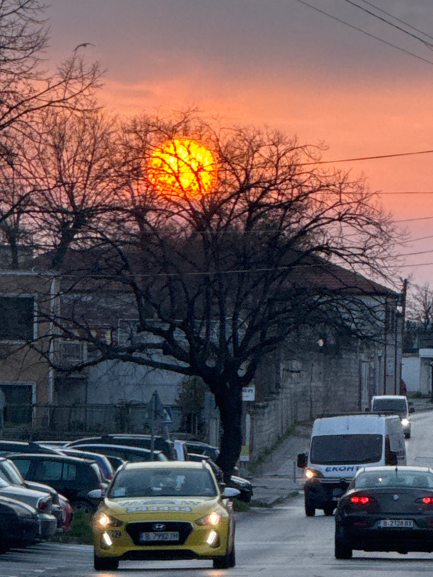 The image captures a sunset in an urban environment, likely Varna, Bulgaria. A bare tree is silhouetted against the setting sun, which is a bright orange orb. In the background, buildings suggest a re…read more