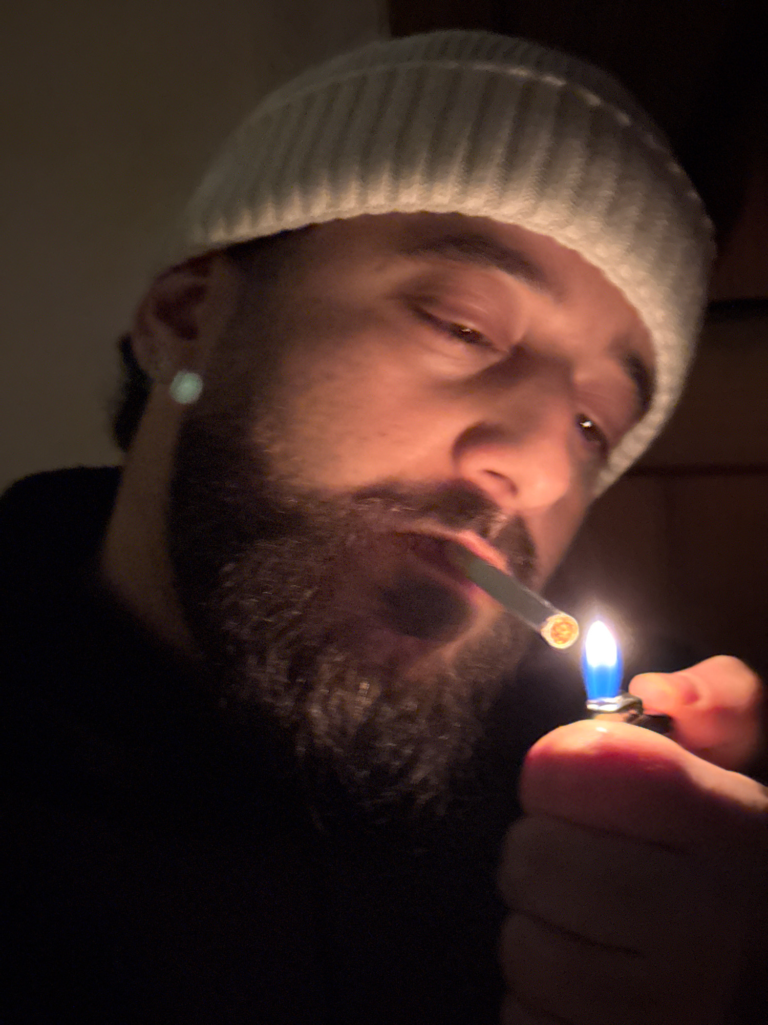 A man is shown from a low angle, with a white beanie on his head and a dark beard. He holds a lit lighter in front of a cigarette in his mouth. The background is dark and indistinct. There is no indic…read more