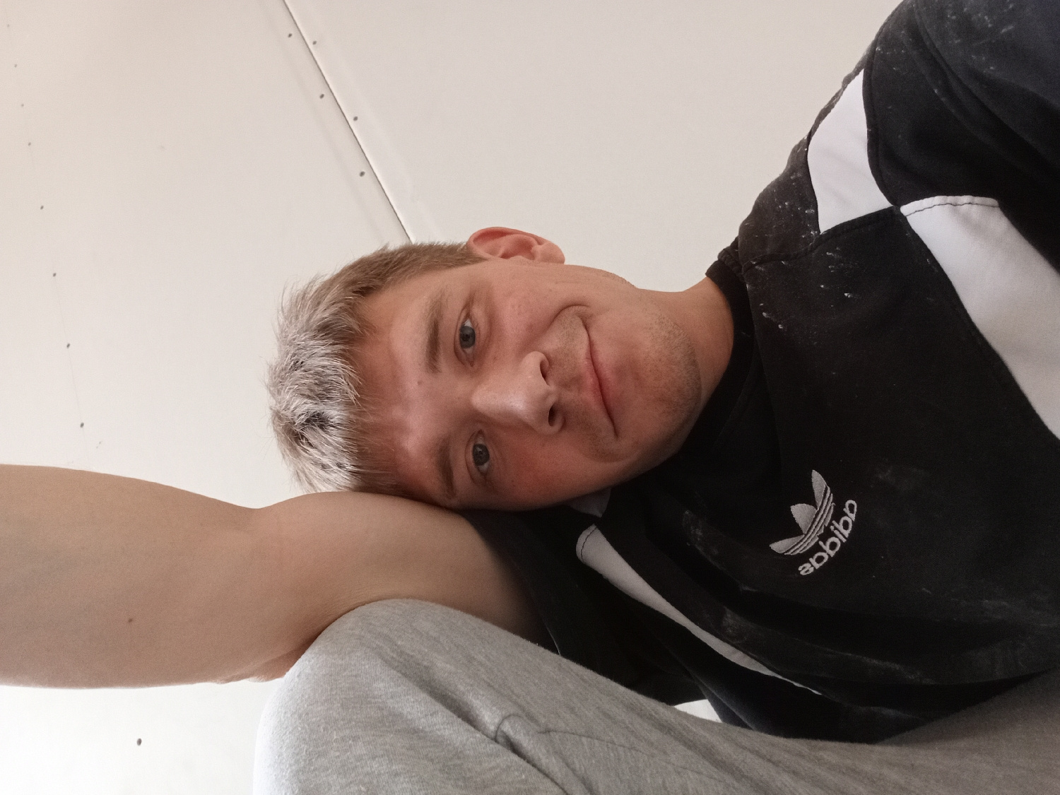 A man is depicted in a low-angle, close-up shot, likely a selfie, looking directly at the camera with a slight, relaxed smile. His head is tilted and resting on his bent left arm, while his body exten…read more