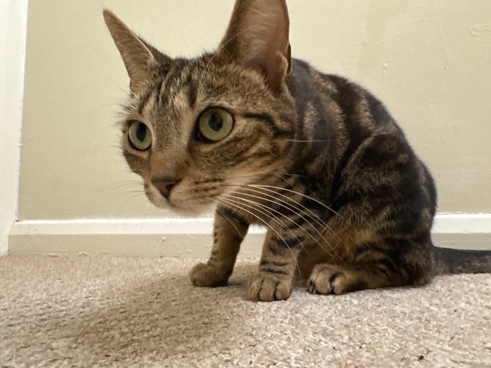A brown tabby cat is crouched low to the ground on a beige carpet, with its tail extending behind it. The cat is positioned near a baseboard, which separates the carpet from a light beige wall. The ca…read more