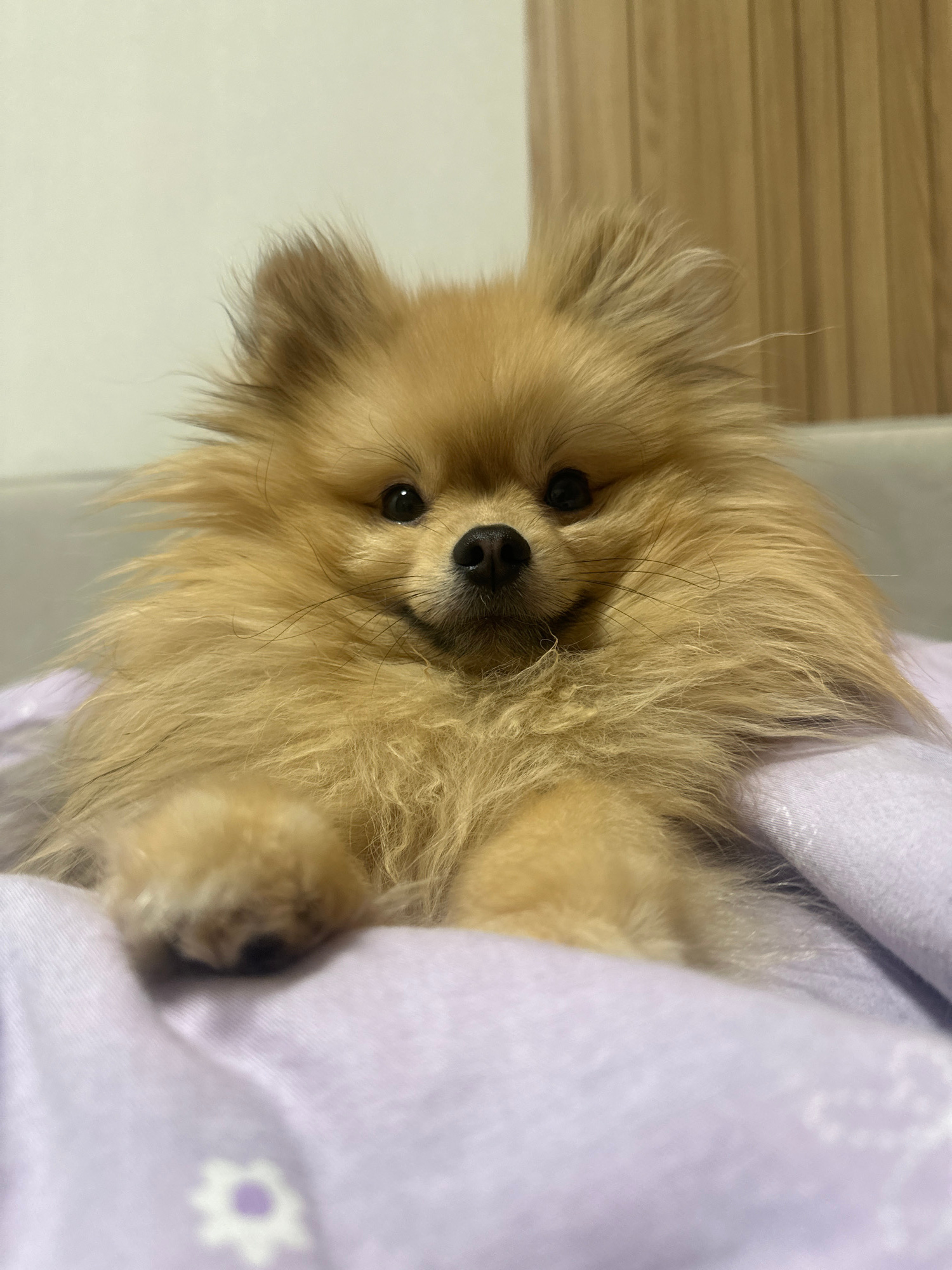 A light brown Pomeranian dog is nestled under a light purple blanket with white flower designs. The dog's head is visible, facing the camera with dark eyes and a black nose. The background is blurred,…read more