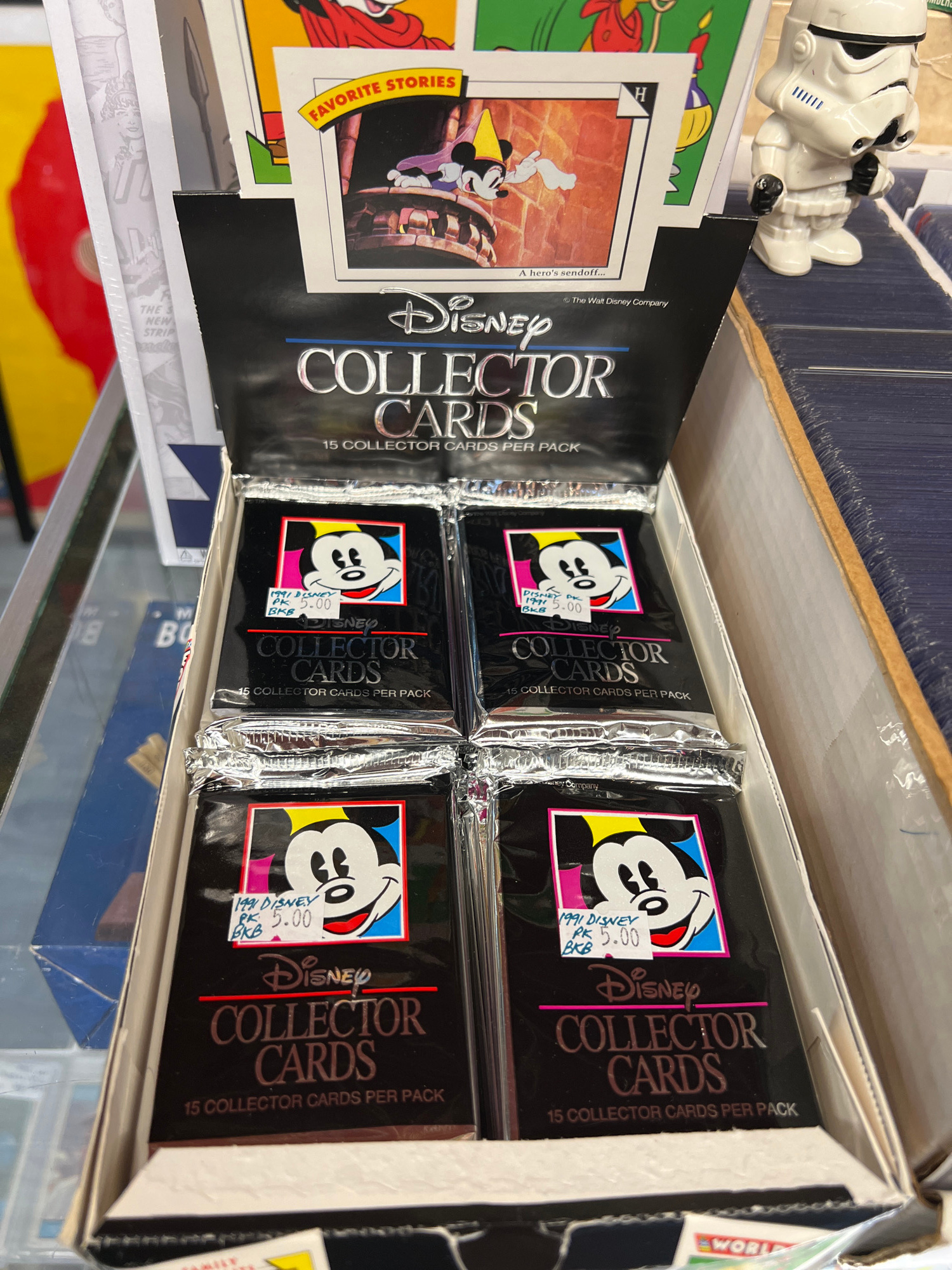 This image shows a box of unopened 1991 Disney Collector Cards in a store, likely a vintage or collectible shop, given the presence of other cards and items like the Stormtrooper figurine. The card pa…read more