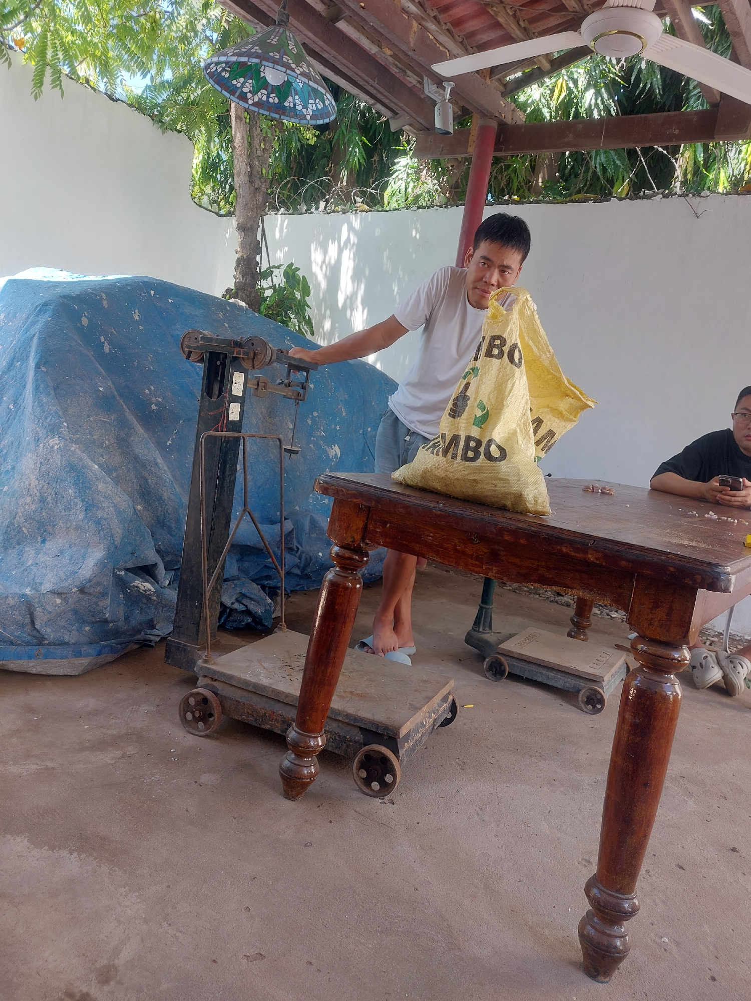 Outside, a brown, wooden, table-like structure with wheeled feet is partially covered by two yellow sacks labeled "MBO." A man wearing a white t-shirt and shorts stands next to the table, his hand res…read more